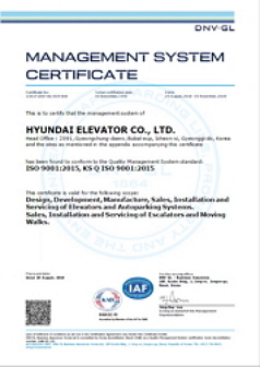 現(xiàn)代電梯已建立并實施了按照ISO 9001和KS Q ISO 9001標(biāo)準(zhǔn)的全公司的質(zhì)量管理系統(tǒng), 并獲得且持有所有電梯業(yè)務(wù)領(lǐng)域(包括電梯)的ISO 9001認(rèn)證。